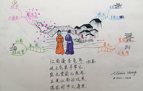 我们这边的疫情控制得很好,在复工复产之前,大家都是很自觉的居家隔离。在朋友圈里先是看到大家在喊无聊,然后练就了一个个的好厨子,再到后来呐喊“神兽”们什么时候可以回归学校,满圈的无可奈何和哭笑不得。有一句话说,变化才是永恒的。这个疫情,让全世界都发生了改变,要让自己去适应改变,就必须先让自己变得有力量。期间,我跟着小伙伴们在腾讯会议讨论了一个话题:疫情下的精进思考。疫情下,我们会有怎样的困难,如何面对,如何解决。我一直在做时间管理,有目标的每一天可以降低焦虑感,虽然很多事情是计划赶不上变化,但是学会调整也是时间管理里面很重要的一项。在我的时间里,不会有无聊这个的概念。学习是让自己变得有力量的方法。要学习的东西很多,我们需要有取舍,工作之外,其中的一个学习我选择了思维导图。它是一种思维工具,可以应用在我的工作、生活、学习当中。在老家居家的几天,我就呆在家里画古诗的思维导图,让自己在周围紧张的气氛中平静下来慢慢思考,画好的导图,也可以用来帮助孩子理解和背诵。